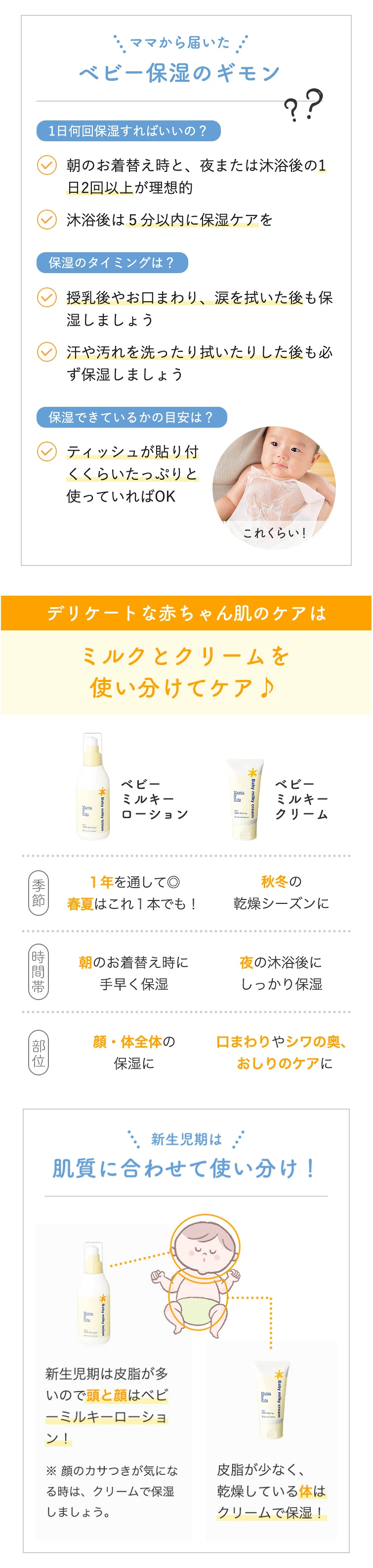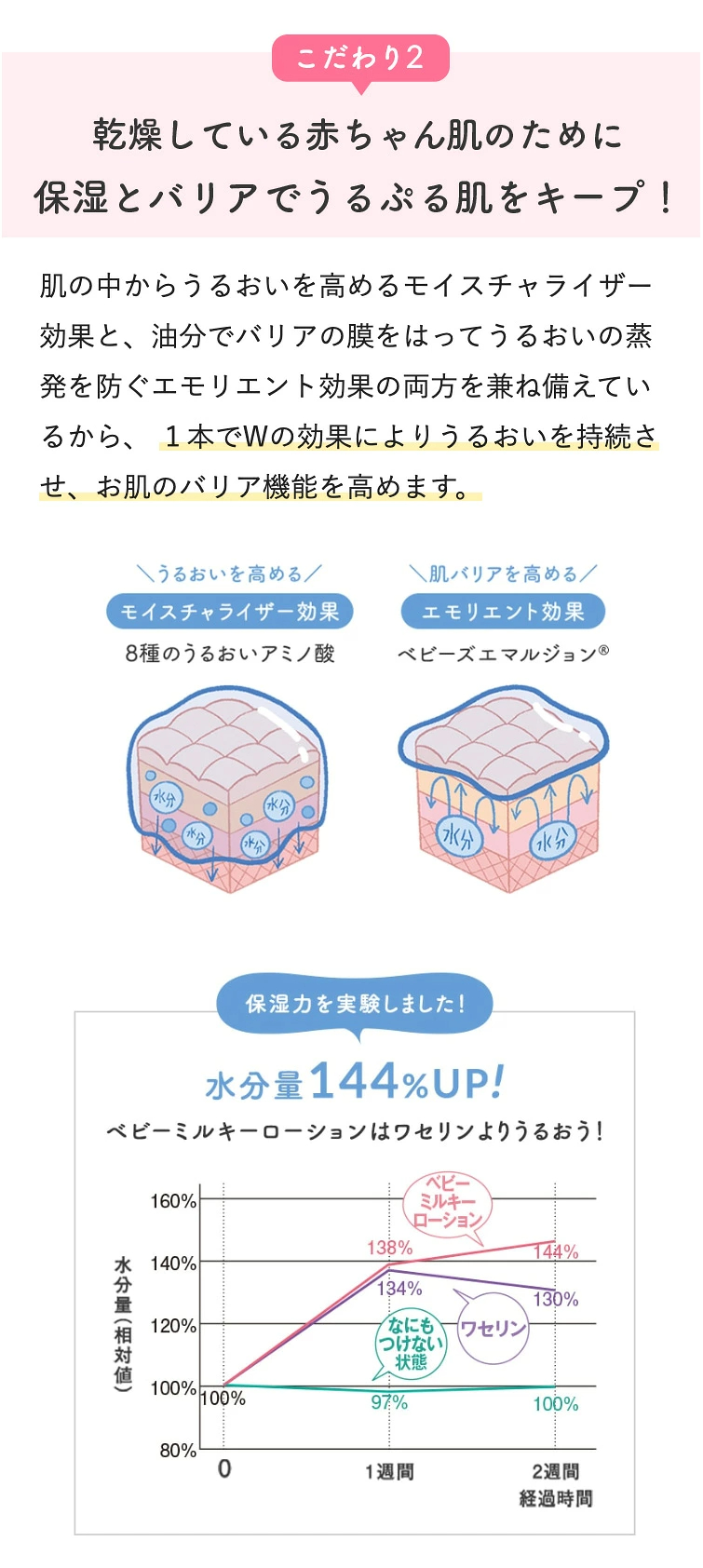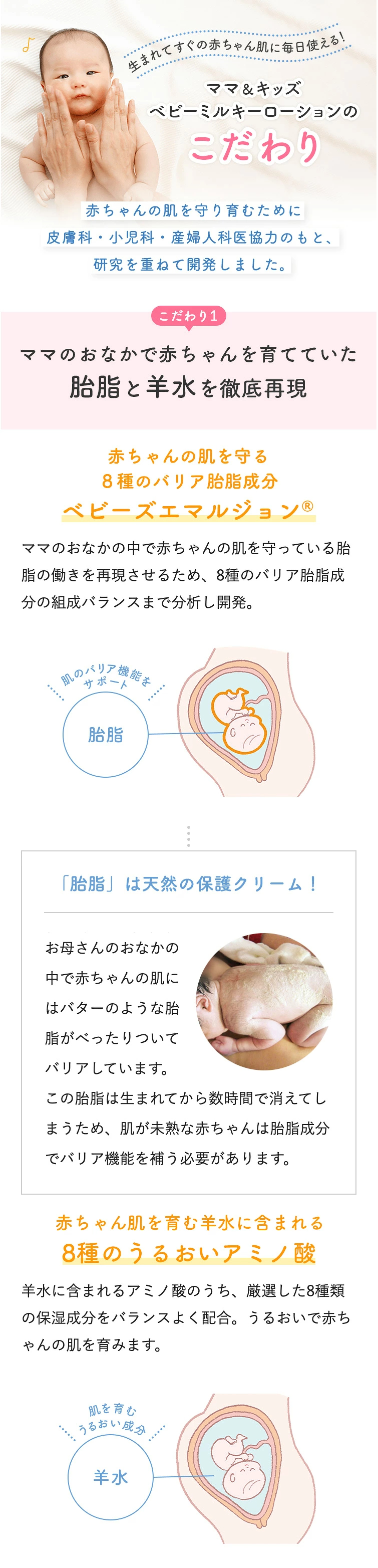 生まれたときからスキンケアを実践するため、赤ちゃんの肌に本当に必要なものだけを配合しました。ママのおなかの中の羊水に含まれる8種のうるおいアミノ酸が、赤ちゃんの肌にやさしくうるおいを与え、胎脂に近い成分ベビーズエマルジョンが肌のバリア機能をサポートします。サラッとなじんでべたつかず、なめらかな使い心地。キッズやママのボディケアにもどうぞ。